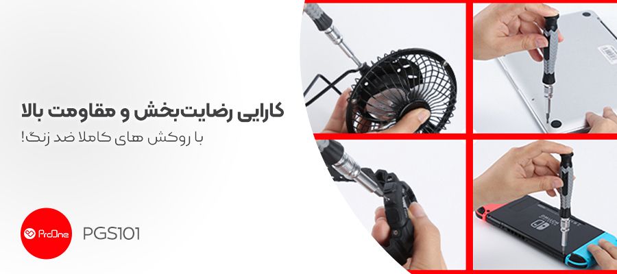 پیچ گوشتی و سری پیچ گوشتی پرووان مدل PGS101، از کیفیت و مقاومت بسیار بالایی برخوردار است؛ به طوری که روکش این پیچ گوشتی ها کاملا ضد زنگ بوده و برای کارهای مختلفی مانند تعمیر عینک، محصولات الکترونیکی، تلفن، لپ تاپ، اسباب بازی و… مناسب است. سری های پیچ گوشتی این محصول از آلیاژ آلومینیوم ساخته شده و دارای حالت مغناطیسی است تا بتواند پیچ های کوچک را جذب کند و به این ترتیب، از گم شدن آنها جلوگیری به عمل آید. دسته پیچ گوشتی این مجموعه نیز از جنس آلیاژ آلومینیوم بوده و در تولید آن از فناوری اکسیداسیون آنودایز استفاده شده است. این ویژگی باعث شده تا پیچ گوشتی های پرووان مدل PGS101، مقاومت بسیار خوبی در برابر ضربه و خوردگی داشته باشند.