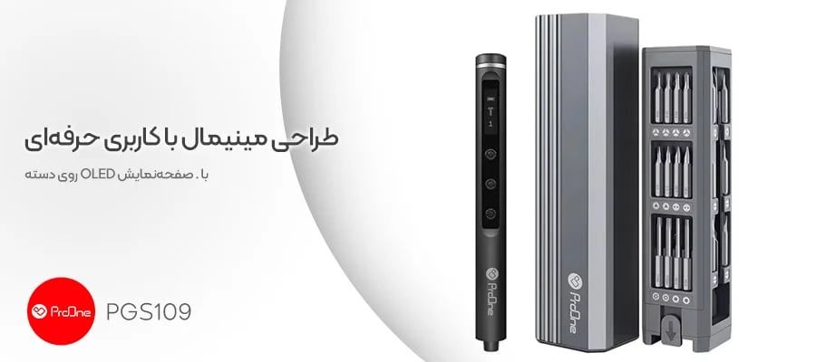 ست پیچ گوشتی PGS109 در یک جعبه آلومینیومی مستحکم و جمع وجور ارائه می شود که کیفیت ساخت آن در همان نگاه اول مشخص است. بدنه ی اصلی از ترکیب آلومینیوم، پلاستیک مقاوم ABS و فولاد S2 ساخته شده تا هم دوام داشته باشد و هم در دست گرفتنش حس حرفه ای بودن را منتقل کند. صفحه نمایش OLED روی دسته، امکان تنظیم 5 سرعت مختلف را فراهم می کند و میزان باتری را نیز نمایش می دهد. تمام این امکانات تنها در ابعادی معادل 17.5×4.5 سانتی متر و وزنی حدود 412 گرم جمع شده اند؛ یعنی چیزی که نه تنها قدرتمند است، بلکه واقعاً قابل حمل است.