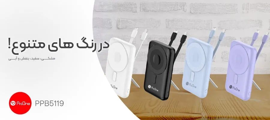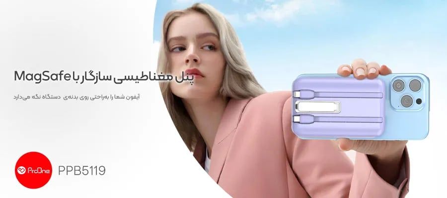 وقتی در مسیر محل کار هستید، از جلسه ای به جلسه ی دیگر می روید یا در تاکسی اینترنتی دنبال مسافر بعدی می گردید، شارژ کردن گوشی و ساعت هوشمندتان باید به اندازه ی روشن کردن ماشین، ساده و بی دردسر باشد. پاوربانک بی سیم ProOne مدل PPB5119 دقیقاً برای همین شرایط طراحی شده با ترکیبی از چند قابلیت کلیدی مثل شارژ مغناطیسی، پشتیبانی از اپل واچ، پایه ی نگهدارنده، و طراحی مناسب استفاده رومیزی یا داخل خودرو. اگر به دنبال یک پاوربانک مدرن برای روزهایی پررفت وآمد هستید، این محصول همان انتخابی ست که همیشه در دسترستان می ماند.
